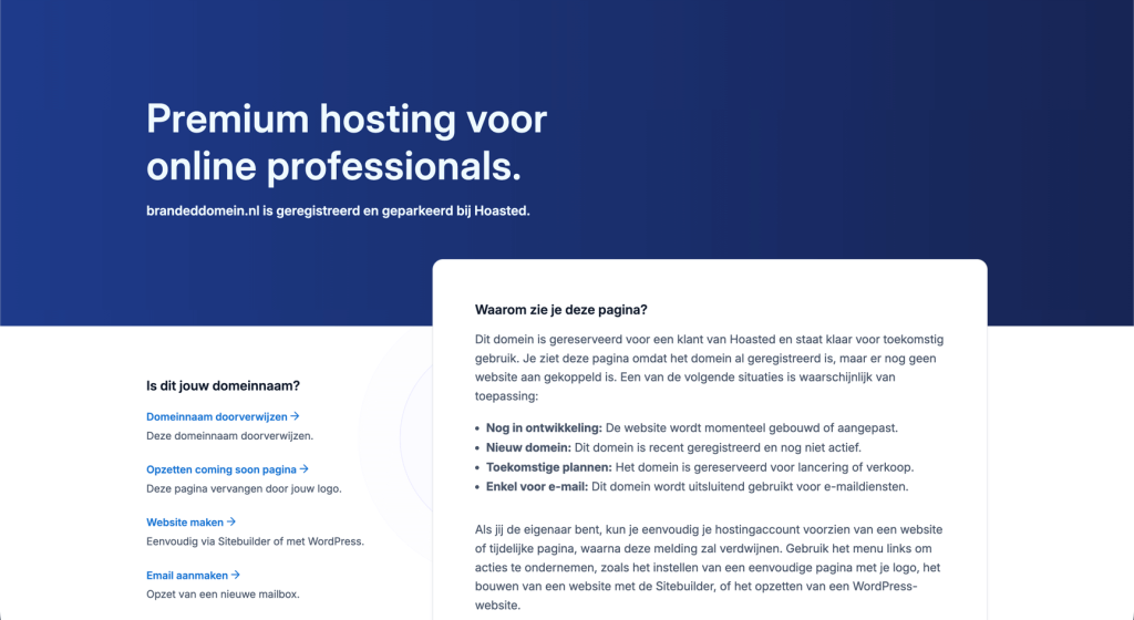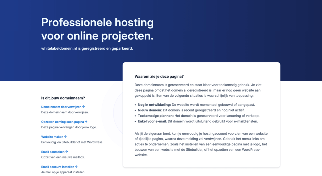 Een domein dat net is geregistreerd of gekoppeld, hoort geen technische melding te tonen. Ook in de ontwikkelfase wil je een nette en duidelijke presentatie.